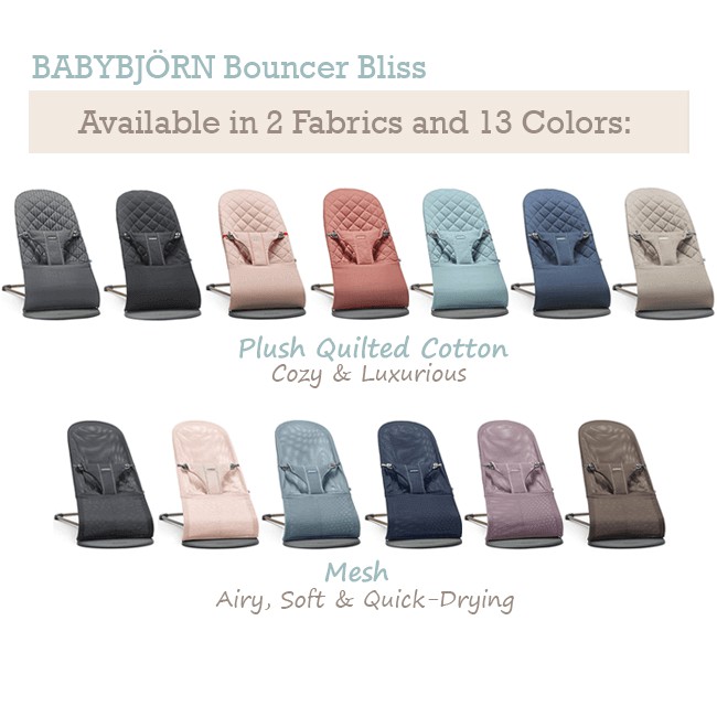 Now you can easily renew your new or used Bouncer Balance Soft or Bouncer Bliss with replacement fabric seats. The baby carriers lining is made of 100 cotton and the padding is made of polyester and. The Baby Bjorn Bouncer cover comes in a variety of fabrics and all are very soft on babys delicate skin. 3D mesh is made of 100 polyester a supersoft flexible fabric that dries quickly after washing. All materials meet the criteria. Wash your baby carrier separately preferably in a washing bag and use a mild bleach-free detergent. We recommend washing your fabric cover in a laundry bag or pillow case. 80 polyester 16 cotton 4 elastane back section material. The tactile qualities of our 3D mesh enhance the closeness between you and your baby and the high quality of the fabric ensures that the baby carrier retains its shape wash after wash.