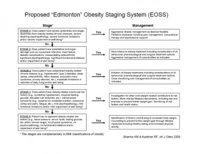 Edmonton Obesity Staging System Wednesday February 11 2009. The Edmonton obesity staging system may offer improved clinical utility in assessing obesity-related risk and prioritizing treatment. We examined the ability of the Edmonton obesity staging system a 5-point ordinal classification system that considers comorbidity and functional status in predicting mortality in a nationally representative US sample. The Edmonton Obesity Staging System EOSS is a more comprehensive measure of obesity-related diseases and predictor of mortality than body mass index BMI or waist circumference. EDMONTON OBESITY STAGING SYSTEM -Staging Tool STAGE 0 NO sign of obesity-related risk factors NO physical symptoms NO psychological symptoms NO functional limitations Case Example. In this study surgery improved cardiovascular risk factors and prevented type 2 diabetes both in noneligible and eligible patients. The aim of the study was to apply the EOSS-P on a Greek pediatric cohort and assess risk factors associated with each stage compared to normal weight controls.